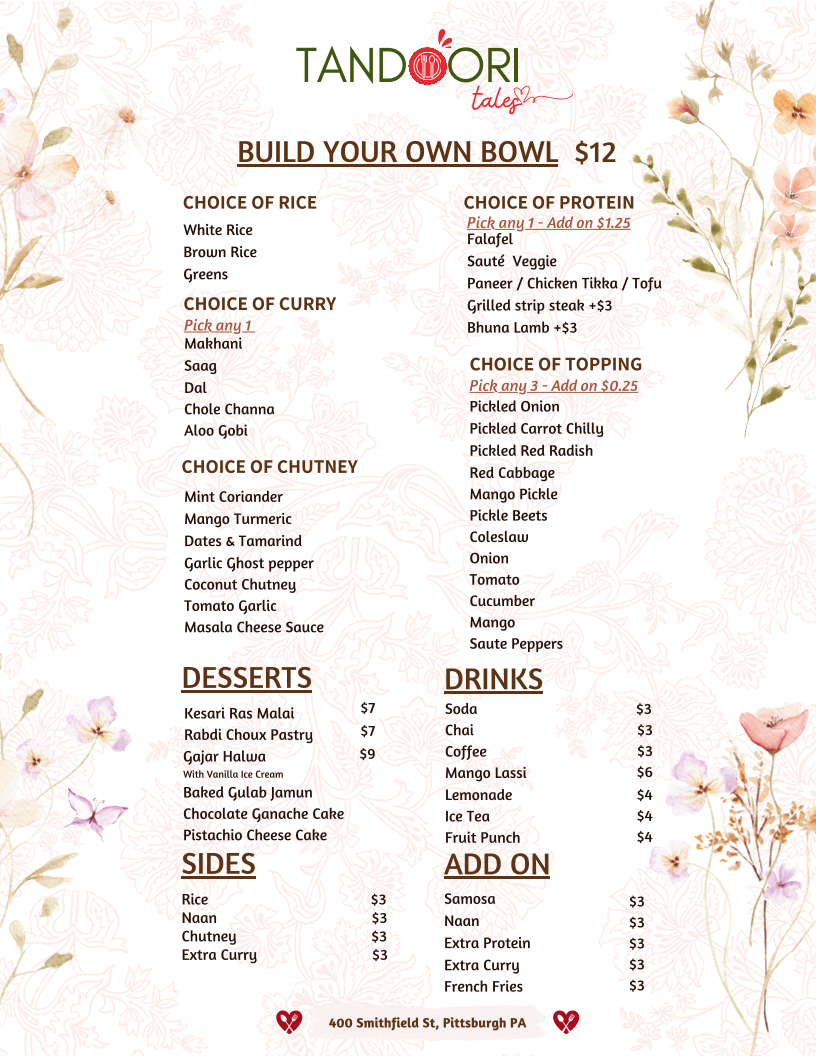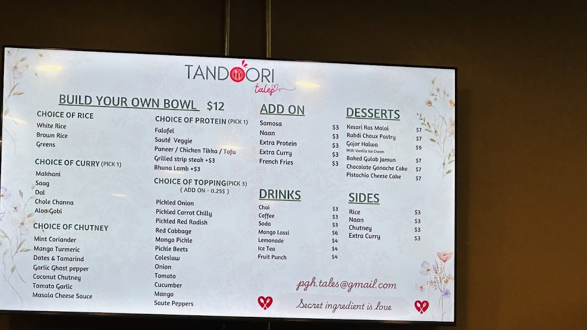 Many diners rave about the customization available, with generous portions served in a clean and inviting atmosphere. Whether you crave a hearty bowl or distinct flavors of freshly made curries, Tandoori Tales has something for everyone. It's a newfound gem that blends authenticity with modern dining, ensuring every meal is a flavorful story waiting to be savored.